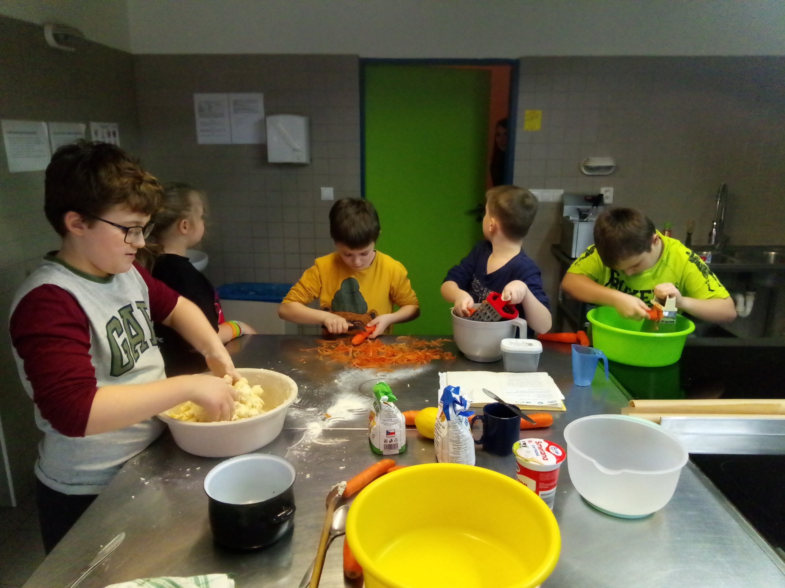 Středeční odpoledne 14. února jsme pracovali ve školní kuchyňce. Upekli jsme plné čtyři plechy výborných makových preclíčků. A k nim jsme si stačili ještě připravit dva saláty – mrkvový sladký a slaný z čínského zelí s mrkví. Zajímavé je, že peklo víc kluků než holčiček 🙂