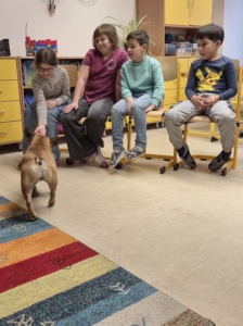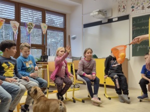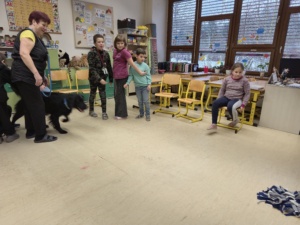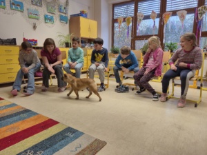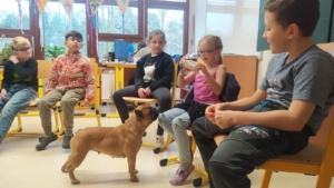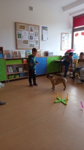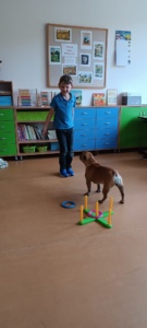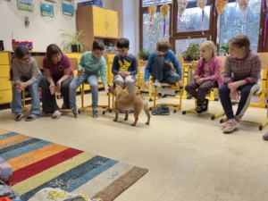 V úterý 19.4. za náma přijela paní s dvěma pejsky na canisterapii. Nejdříve jsme se s pejsky seznámili a zjistili, že se jmenují Barunka a Toník. Oba jsou dobře vycvičení, protože se nám všem povedlo oba přivolat. Poté se Barunka s Toníkem vrhli na hraní a ze skluzavky jsme jim posílali dobrůtky, také sme jim dobrůtky shovali do stupňovité věže a oni čumáčky postupně věž bouraly a na každém stupni měli odměnu. Nakonec se přece jen ukázalo, že Barunka je o něco malo šikovnější, protože uměla sundávat oblečení a poté ho i podat, to nás moc pobavilo, při sundávání ponožek, si na ně večer určitě vzpomeneme.